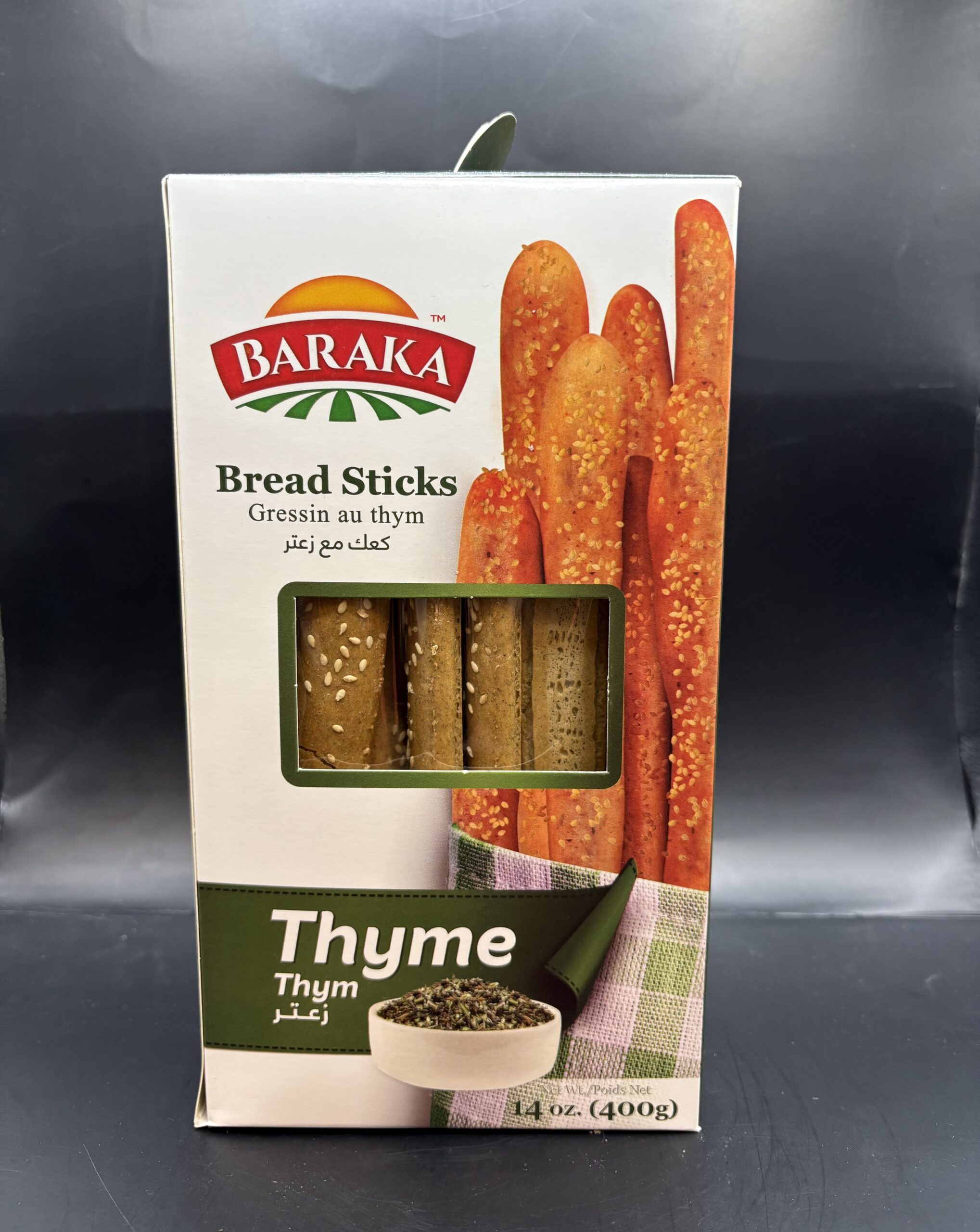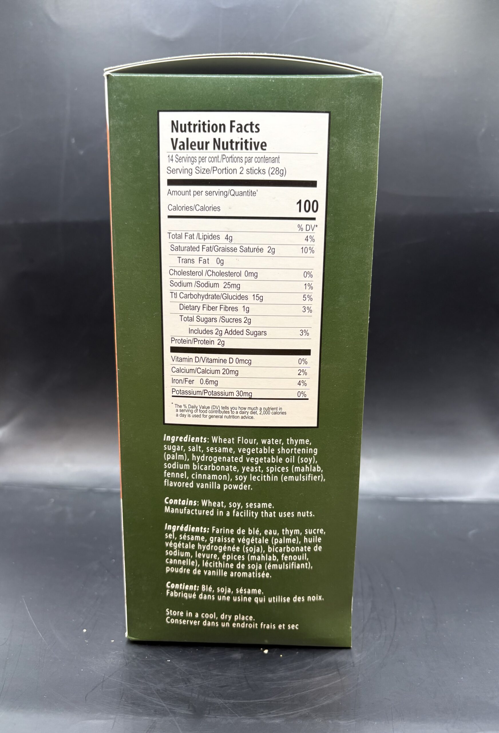 Ingredients: Wheat Flour, Water, Thyme, Sugar, Salt, Sesame, Vegetable Shortening (palm), Hydrogenated Vegetable Oil (soy), Sodium Bicarbonate, Yeast, Spices (mahlab, fennel, cinnamon), Soy Lecithin (emulsifier), Flavored Vanilla Powder.