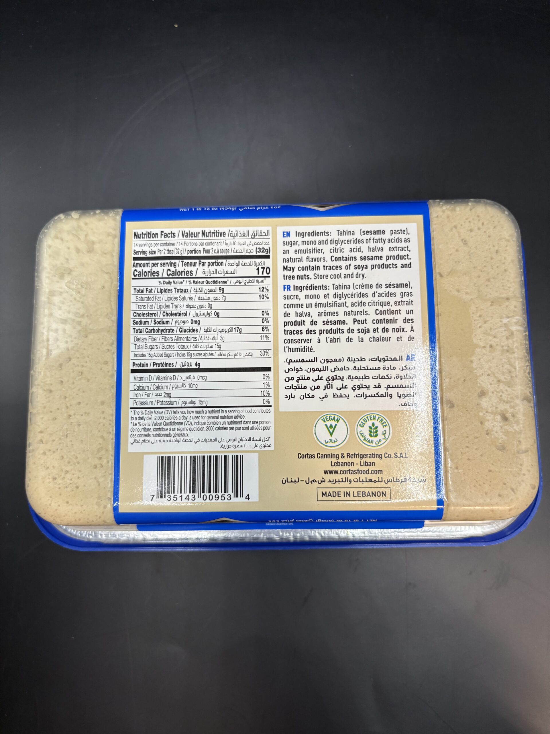 Ingredients: Tahina, Sugar, Mono and Diglycerides of Fatty Acids as an Emulsifier, Citric Acid, Halva Extract, Natural Flavors.