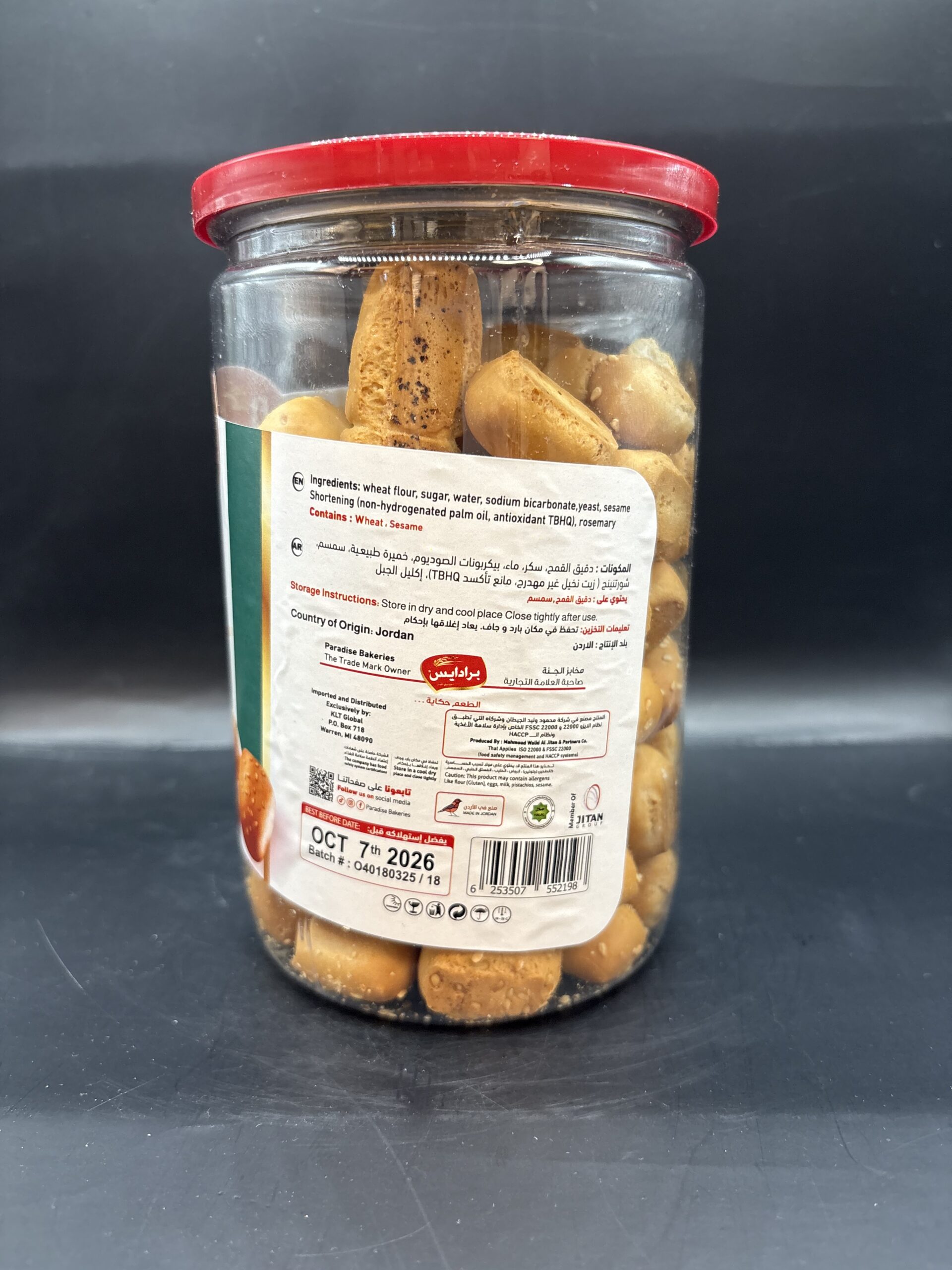 Ingredients: Wheat Flour, Sugar, Water, Sodium Bicarbonate, Yeast, Sesame, Shortening, Rosemary
